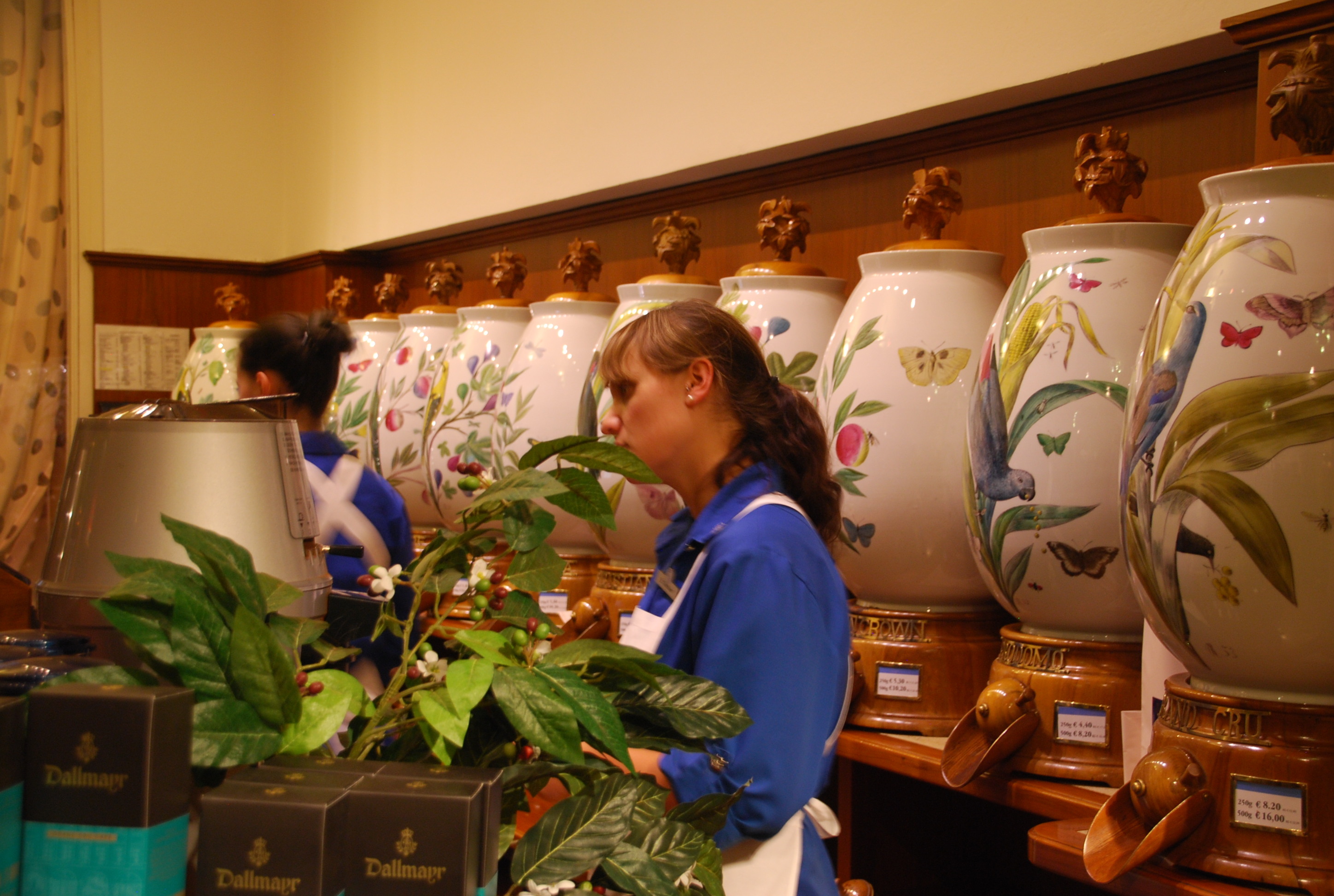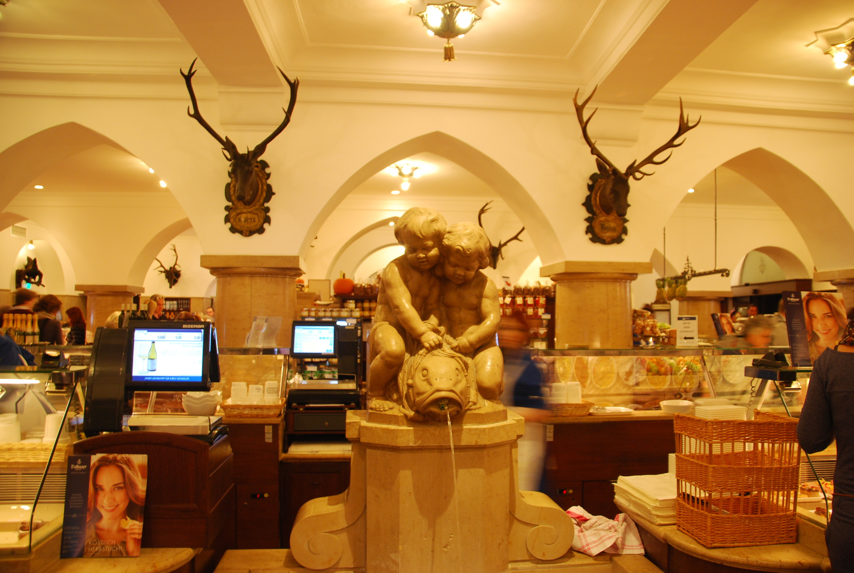 Dallmayr ne laissera pas insensible les gourmets. Cette institution de l’épicerie fine dont l’origine remonte au XVIII ème siècle propose des marchandises triées sur le volet. Fromages, charcuterie ou gâteaux sont présentés avec la même rigueur et servis par du personnel très digne en tablier bleu et blouse blanche. Une fontaine est installée dans la grande salle et fait la joie des enfants. Les rayons thé et cafés, implantés plus loin, de part et d’autre de l’allée centrale sont magnifique avec les jarres en porcelaine fleuries, rondes pour les feuilles de thé, plus hautes pour les grains de café. Quant à l’espace confiserie, ses boîtes sont un régal pour les yeux.