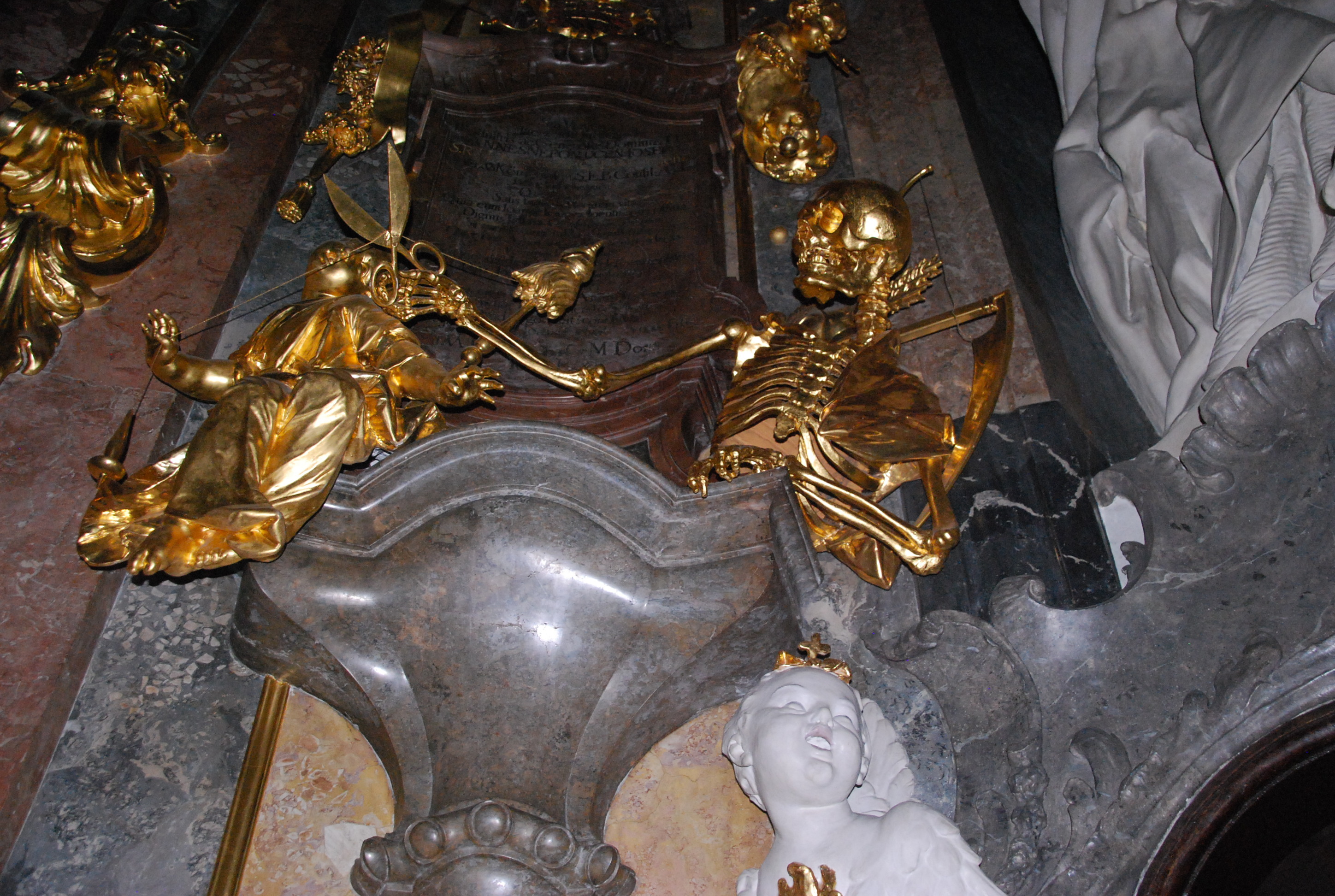 quant à la Asamkirche, la chapelle des célèbres frères Asam, elle est éblouissante. Fresques, motifs dorés, stuc, colonnes, angelots y abondent sans oublier quelques rappels de la faucheuse, mais traitée fastueusement en or. La façade et le plafond de l’entrée sont aussi emblématiques du style rococo.
