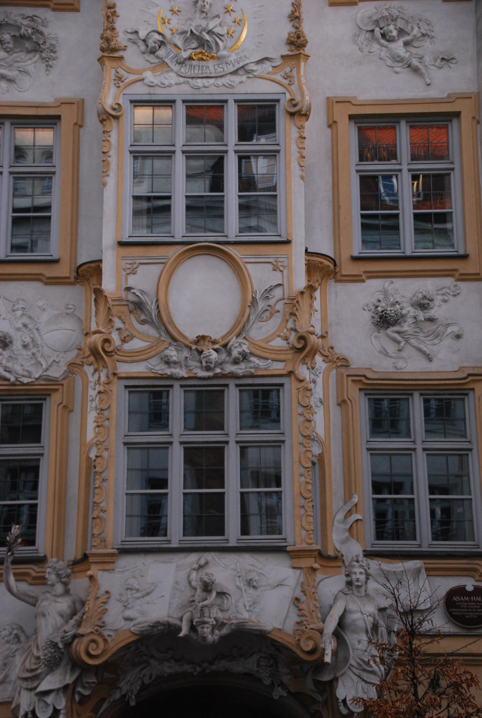 La Maison des frères Asam qui jouxte l’Asamkirche rivalise avec la façade de cette église pourtant bien pourvue. Sur un fond jaune pâle, personnages, cariatides, angelots et guirlandes se détachent en blanc.