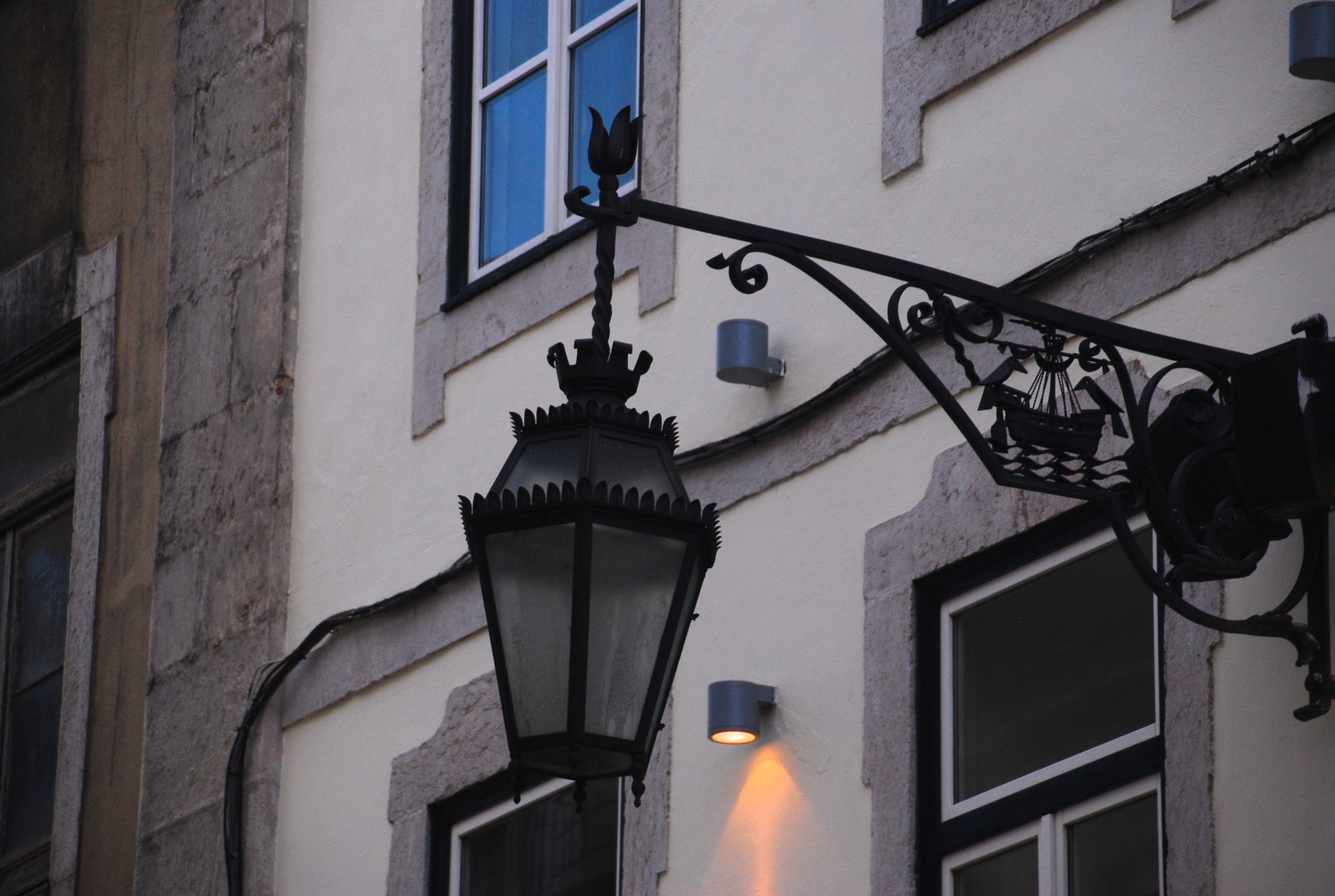 Sur les branches en fer forgé qui soutiennent l’éclairage public accroché aux façades des immeubles, tout comme à certains endroits de la ville en écusson sur des murs, on retrouve ce motif stylisé de bateau avec des oiseaux, des petits clins d’œil de Lisbonne. Autre panneau jubilatoire, en bas du château Sao Jorge, pour ces messieurs qui auraient un besoin pressant.