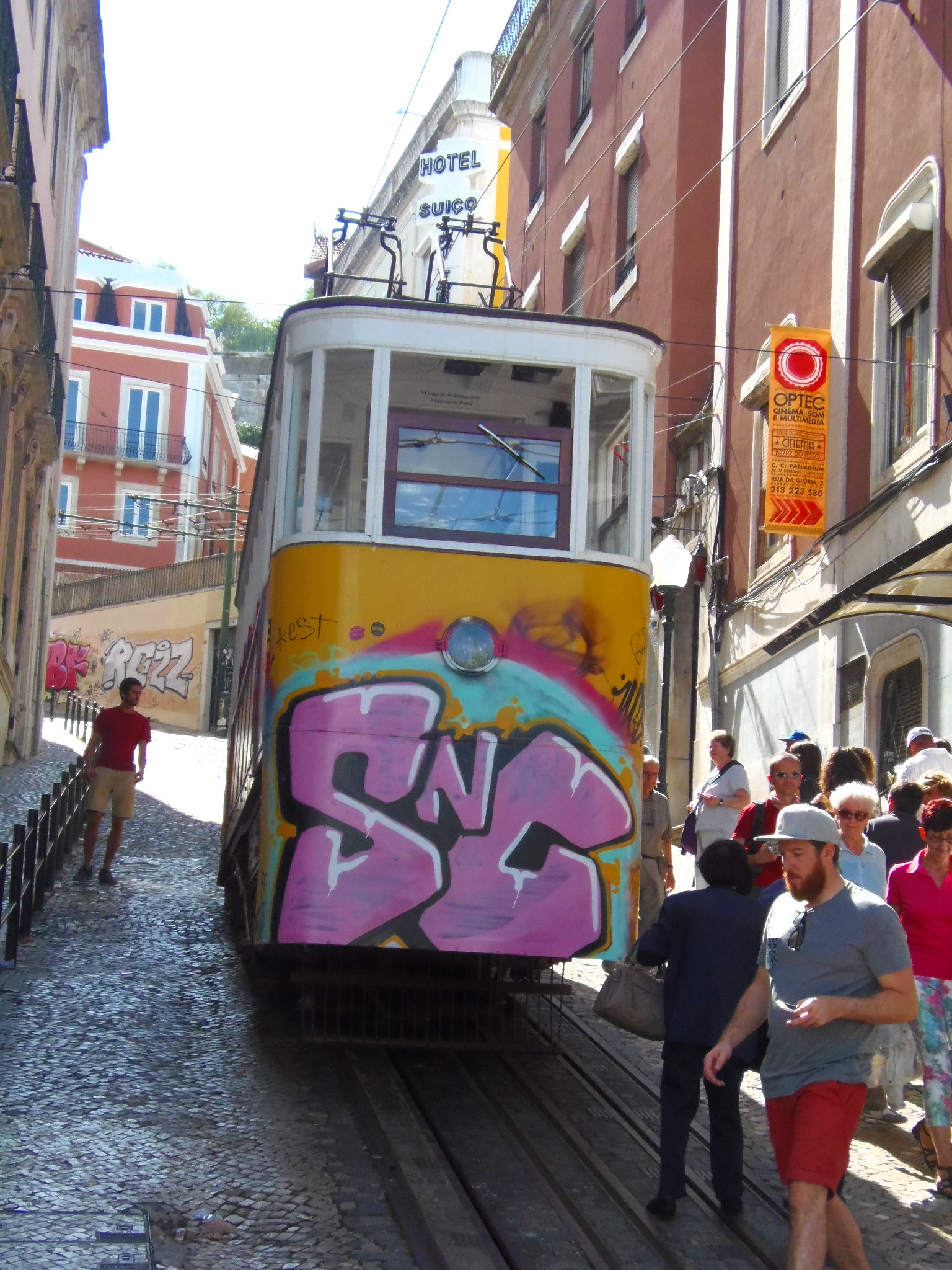 Le célèbre Elevador de Santa Justa qui fait le lien entre la Baixa et le Chiado était en cours de restauration, emmailloté dans des bâches mais la passerelle à l’arrière était, elle, visible.