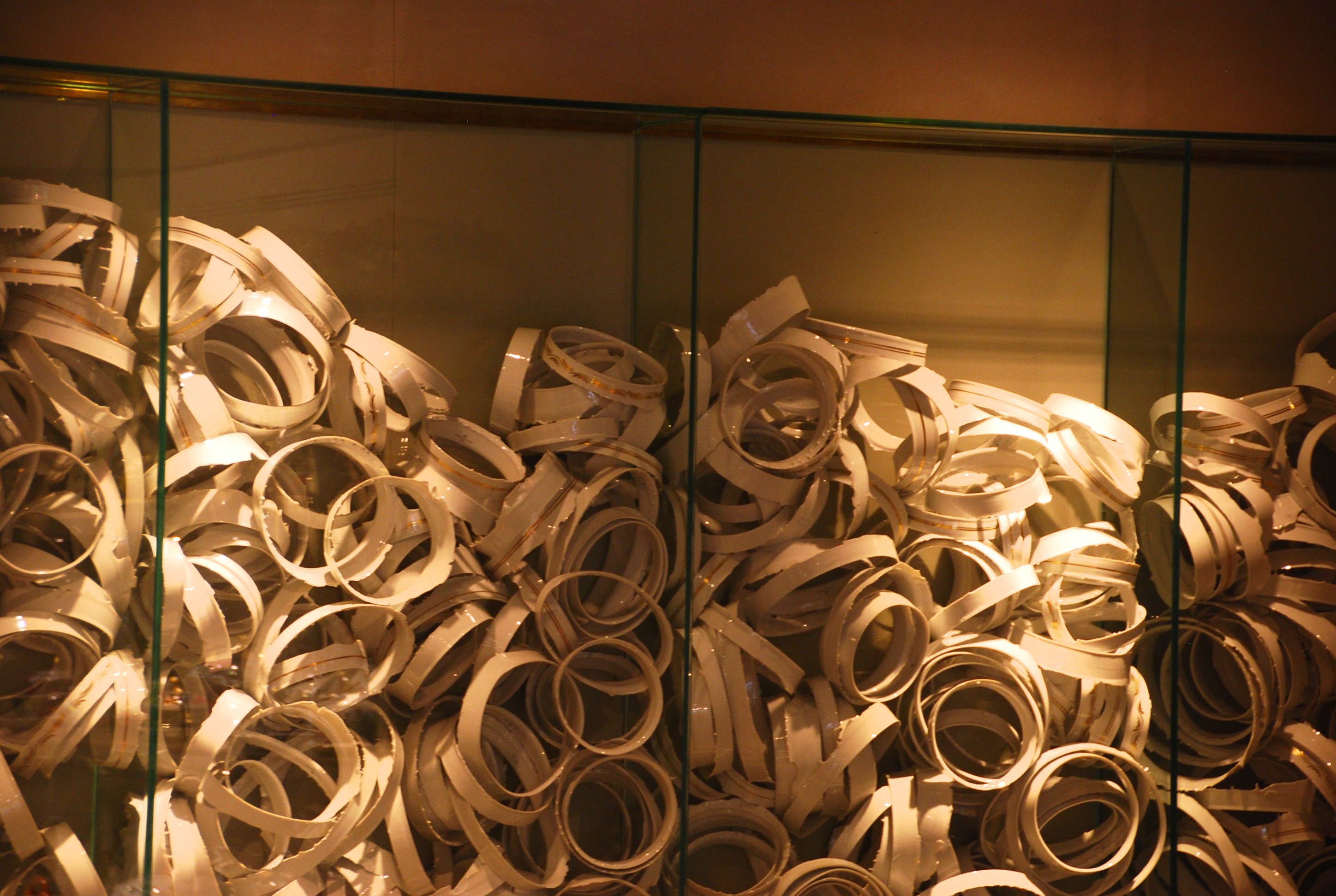 Idée de décor originale, un pan de mur à l’étage de la boutique de Vista Alegre est composé d’un amoncellement de chutes de fabrication en porcelaine.