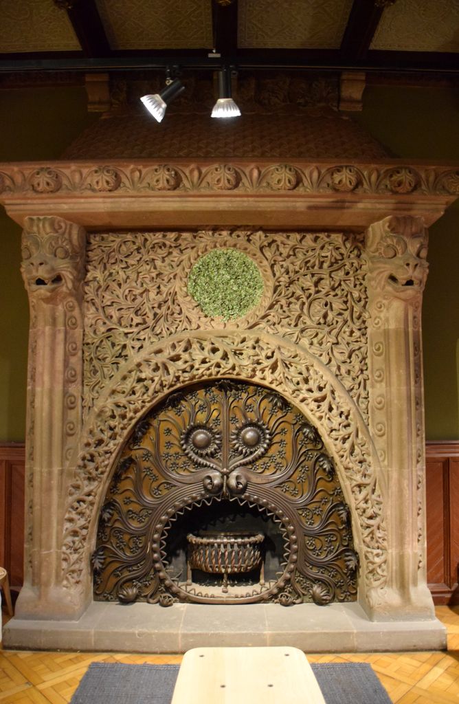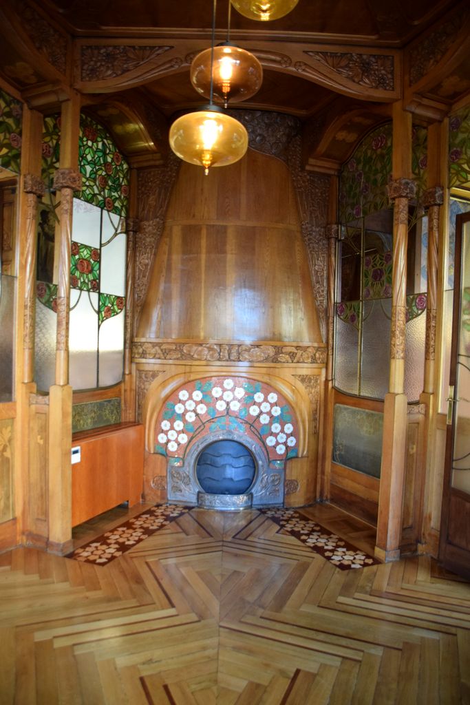 Cheminée en boiserie, entourée de vitraux à la Casa LLeo i Morera à Barcelone.