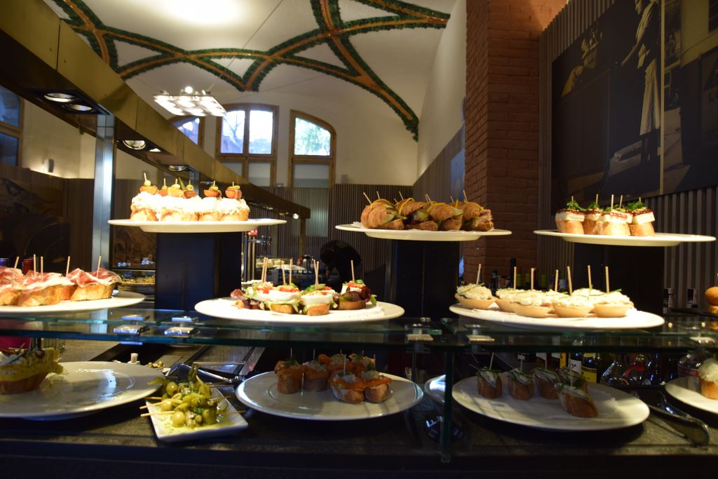 En sortant de Sant Pau, nous nous sommes arrêtés au restaurant 1902 qui se trouve dans l’enceinte de l’ancien hôpital. Ce restaurant est parfaitement bien tenu. Cadre sobre et raffiné sous les voûtes en céramique de Domenech i Montaner, service attentif et belles propositions de tapas. La sélection est variée, goûteuse et très fraîche mais on peut y faire des repas plus traditionnels. Le cadre et la qualité des tapas m’incitaient à penser que l’addition serait salée. Pas du tout, c’est sans doute l’endroit où nous avons mangé le mieux et le moins cher à Barcelone. La confiance est de mise puisque on se sert les tapas que l’on veut et on paie ensuite en fonction du nombre de petites piques qui restent dans l’assiette. Je recommande vivement.