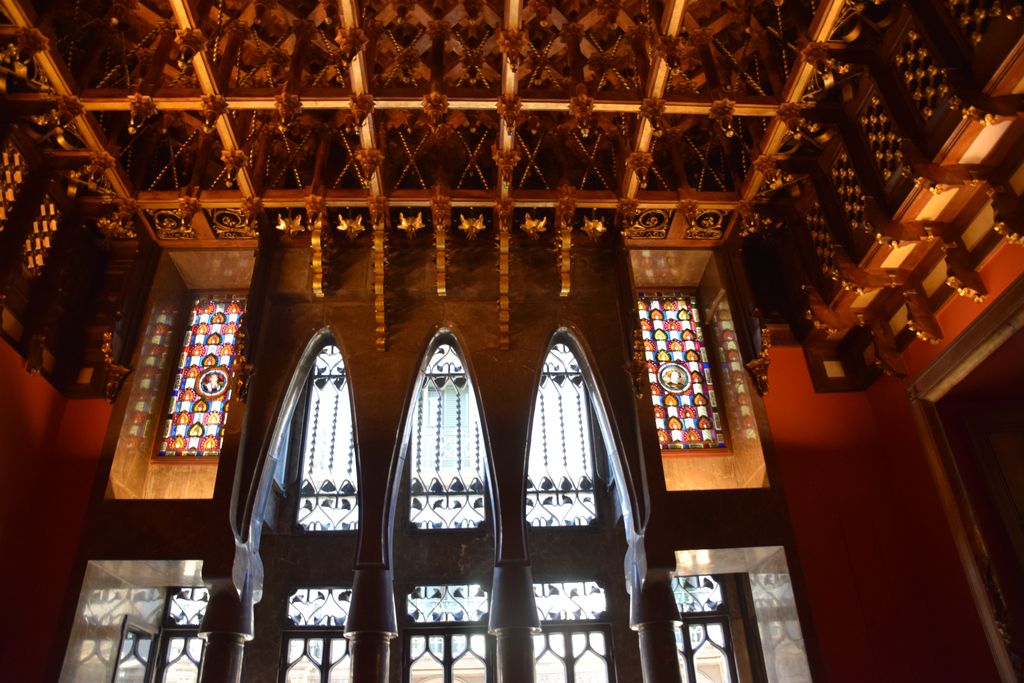 Ouvertures d’esprit gothique, plafond en bois doré à plusieurs niveaux au Palais Güell.