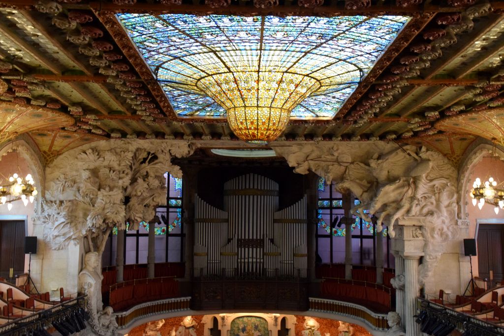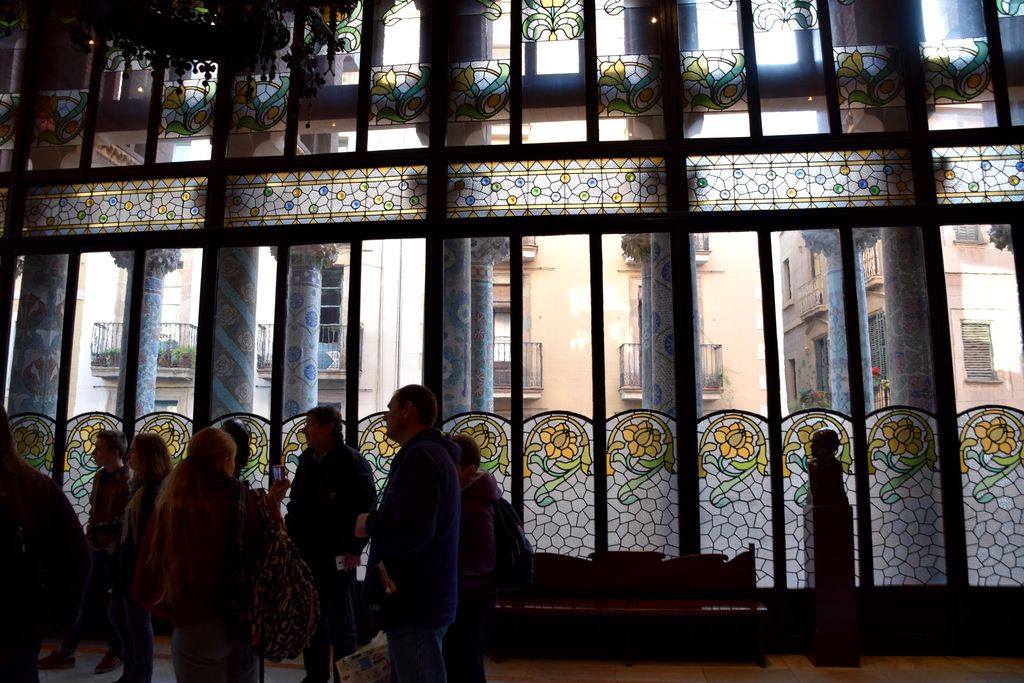 Il arrive à être très lumineux bien que les immeubles qui l’entourent soient très proches. Lluis Domenech i Montaner a réussi à y faire entrer la lumière grâce à l’utilisation du verre. La structure en métal de la salle soutient une immense verrière avec un somptueux vitrail central. Fleurs en céramique et mosaïques font de cette salle un bouquet géant dont les couleurs explosent pour le plus grand plaisir du spectateur. La fond de la scène est habité de muses et de musiciennes pour inspirer les artistes.