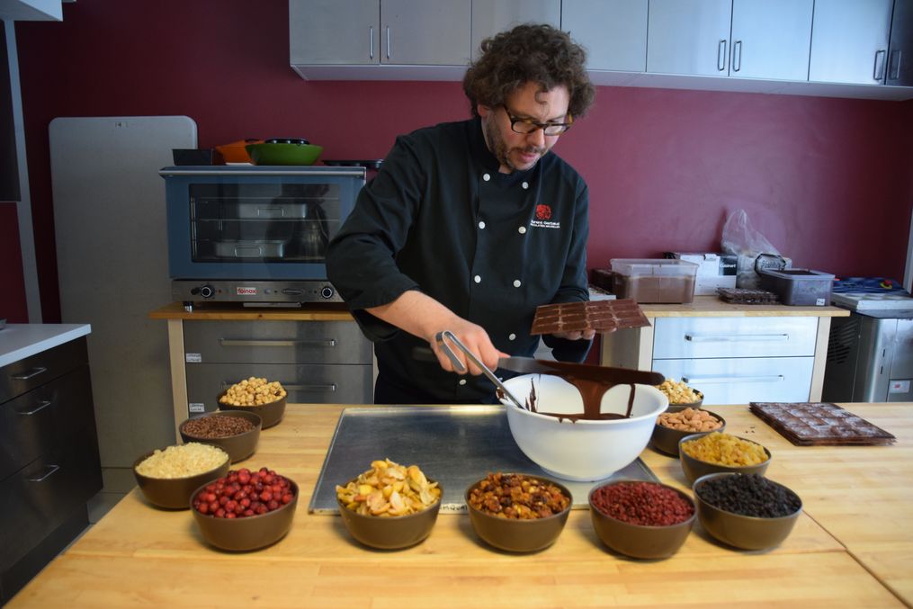 Actuellement, Laurent Gerbaud étudie d’éventuels partenariats. Curieux de tout et bourré d’idées, il est en mesure d’ouvrir de nouveaux horizons gastronomiques. Car il n’est pas seulement un hyper-doué du chocolat. A 13 ans, il cuisinait déjà et il continue à le faire. Avec du chocolat, il est capable de réveiller des plats classiques et d’imaginer des recettes détonantes. En attendant, il dispense son savoir-faire à des petits groupes qui ont envie de s’approcher du l’univers du chocolat. Présentation du produit, explications et travaux pratiques. Sur du chocolat fondu coulé dans un moule, chacun peut marier épices et fruits pour faire ses propres compositions. Un peu de patience, le chocolat prend et c’est la surprise.