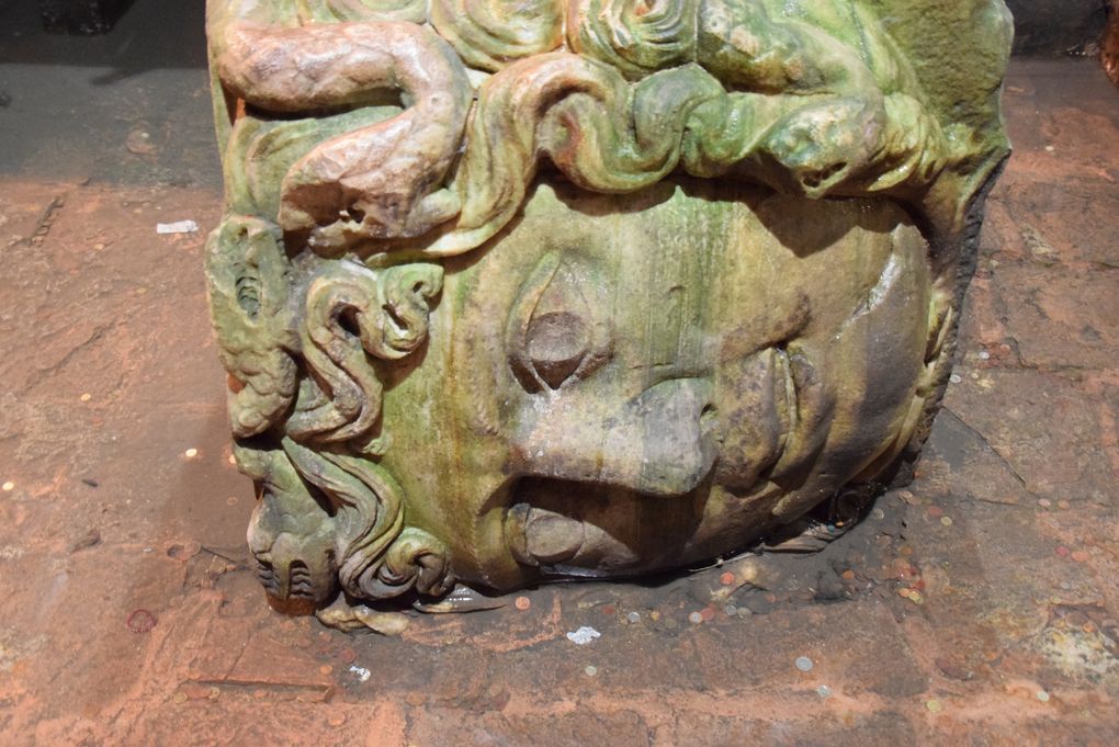 Tête de la Méduse renversée à l’une des extrémités de la Citerne Basilique d’Istanbul.