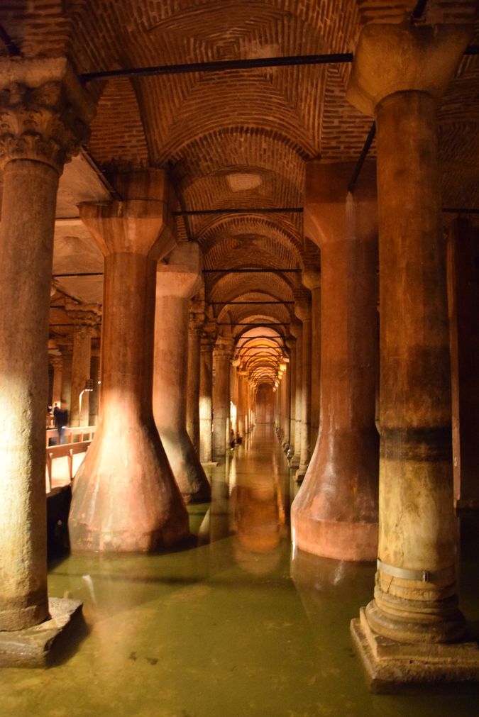 Justinien stockait l’eau en provenance de la forêt de Belgrad située à 19 km d’Istanbul. Elle est entourée de murs en briques de 4 mètres d’épaisseur assemblées avec un mortier spécial qui rend le tout étanche. Sur 70 mètres de large et 140 mètres de long, 336 colonnes en marbre ont été disposées pour soutenir la construction.