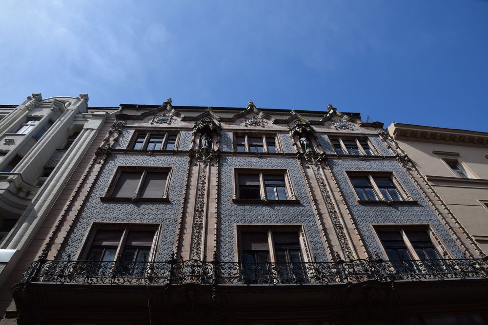 Façade en céramique bleue de l’ancienne Maison Thonet par Odon Lechner à Budapest, rue Vaci.