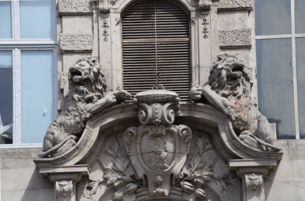 Lions féroces surmontant la porte d’un immeuble de Budapest.