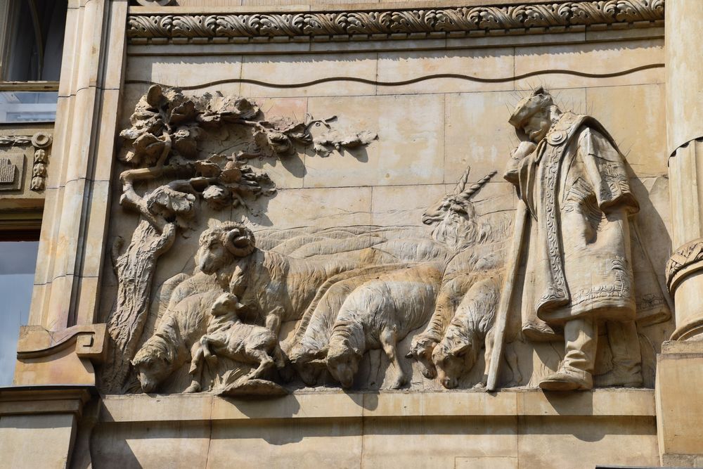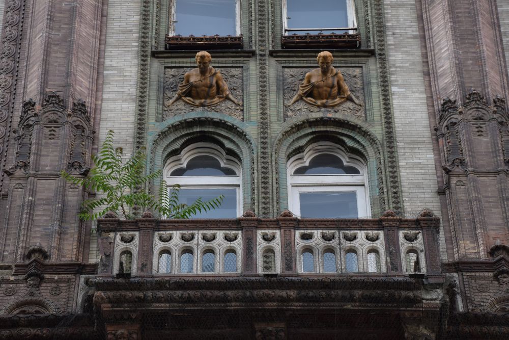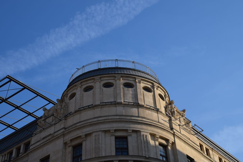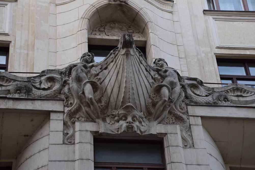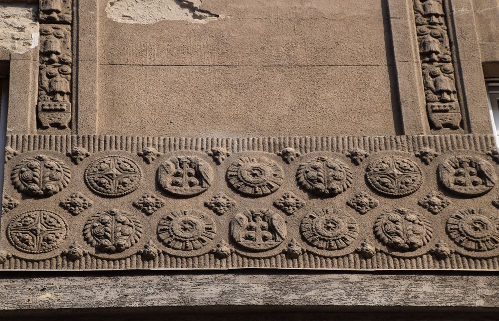 Détail des macarons sculptés soulignant les reliefs de l’immeuble.