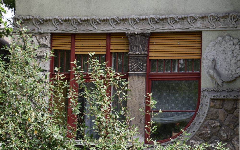 Fenêtre d’un immeuble de Budapest soulignée par une guirlande de fruits et entourée de paons.