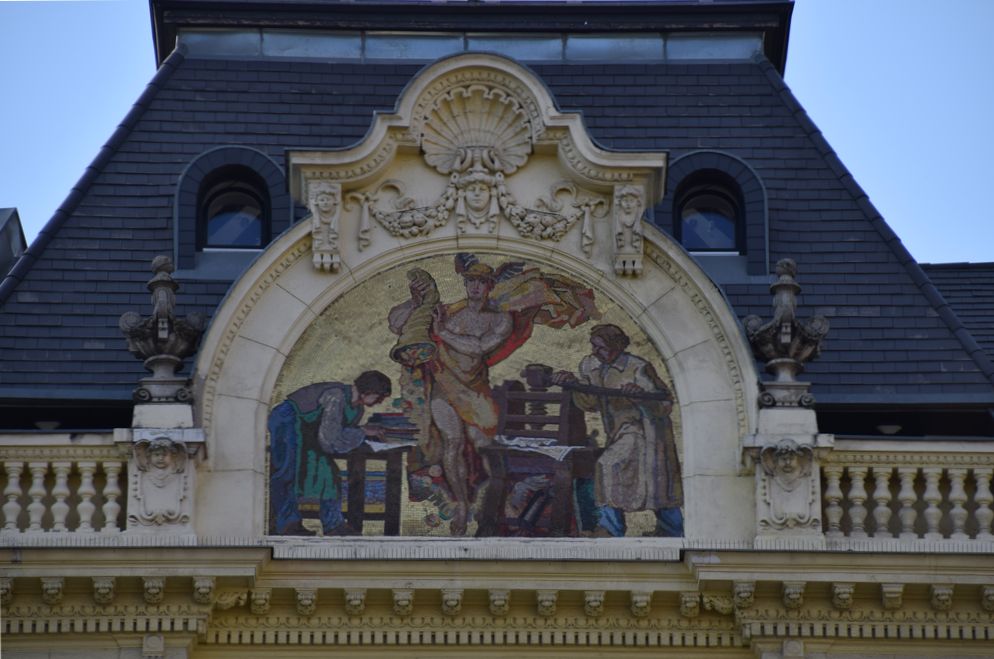Magnifique chapiteau en mosaiques surmontant l’immeuble de l’ancienne Banque Ottomane.