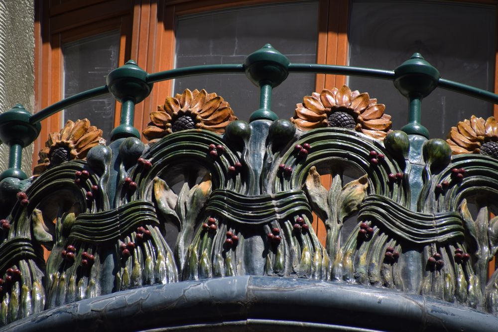 Balcon bordé de fleurs d’inspiration très typée Art nouveau de la maison Bedo Haz à Budapest.