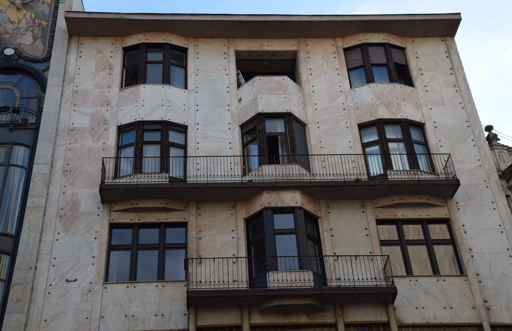 Mariage réussi de la pierre et du métal travaillé en parement sur cet immeuble de Budapest alternant lignes courbes et droites.