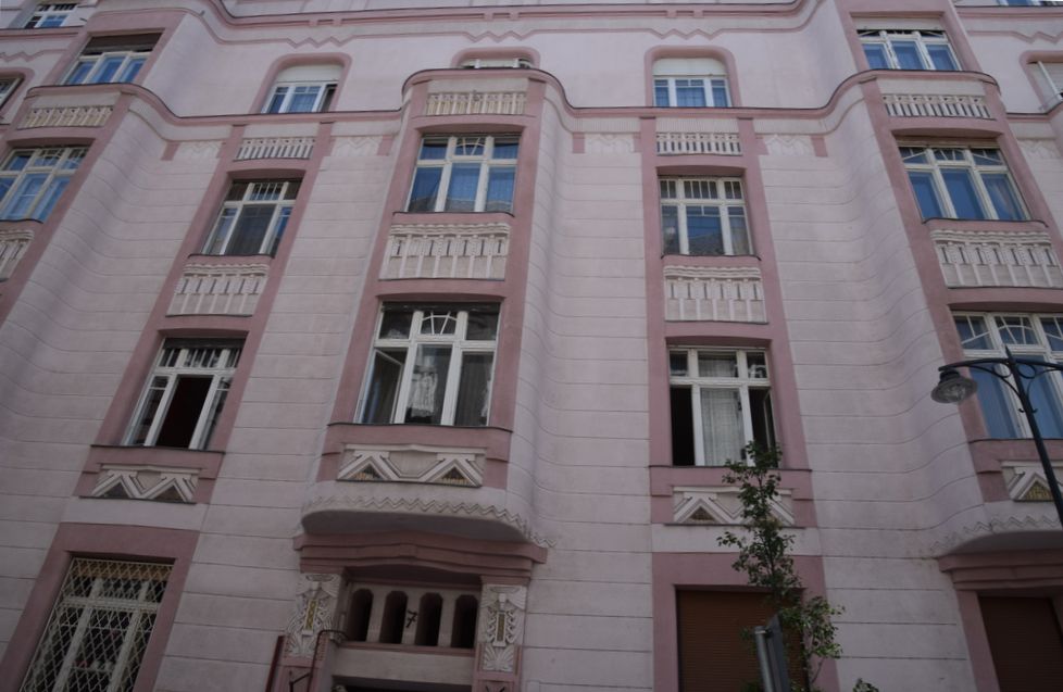 Ondulations et peintures en deux tons de rose donnent de la vie à cette façade de Budapest.