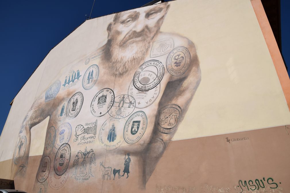 Quand les cachets de la crédence des pèlerins de Saint-Jacques-de Compostelle s’affichent sur un mur de Logrono (Rioja).