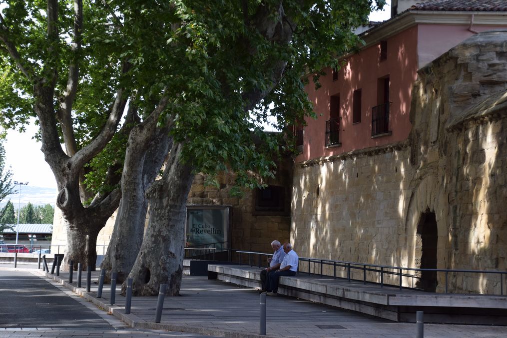 Comme autrefois, discussion sous les arbres qui bordent les anciens remparts de Logrono (Rioja).