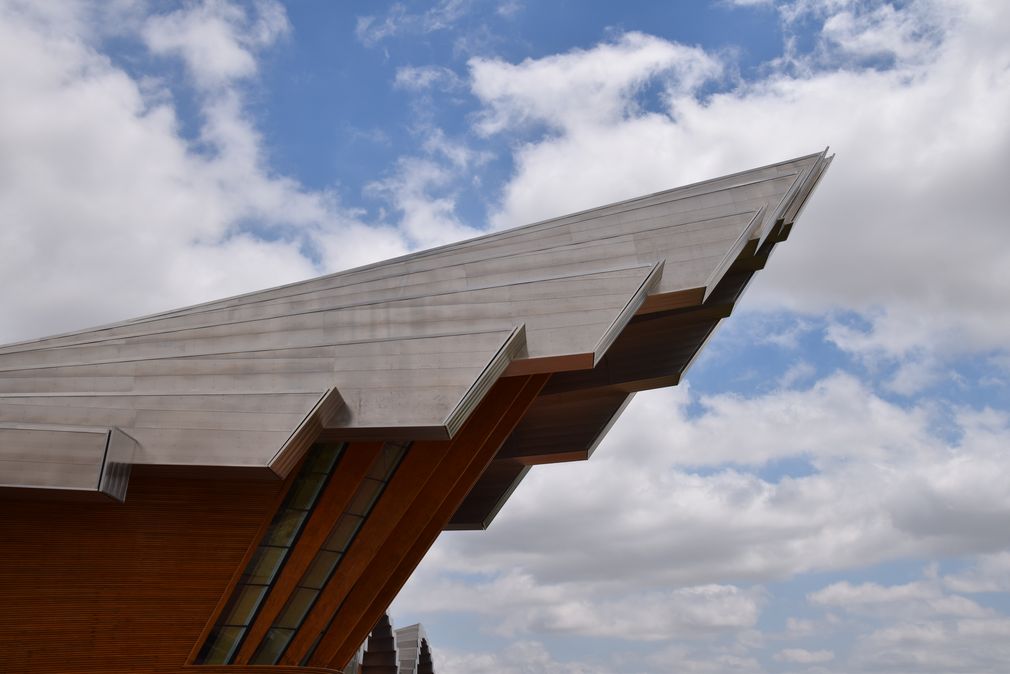 Ce bâtiment rutilant et joyeux à la fois, se trouve dans l’enceinte de Marques de Riscal, « La cité du Vin » qui comprend aussi les installations de l’exploitation dont le chai le plus ancien qui remonte à 1858.