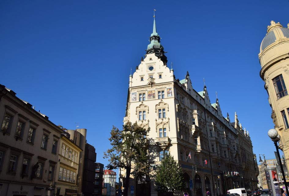 Je n’est pas été déçue par la qualité architecturale cet établissement construit en 1904 par les architectes Vejrych et Pfeifer et qui est classé monument historique. Situé à côté de la Maison Municipale, il cultive un style néo-gothique revu et corrigé par l’Art nouveau. Les façades méritent d’être scrutées avec attention pour profiter de tous les détails.