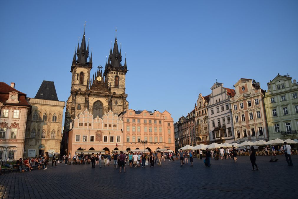 Le soleil se couche sur les tours de l’église Notre-Dame-de-Tyn, les touristes se raréfient place de la Vieille Ville.