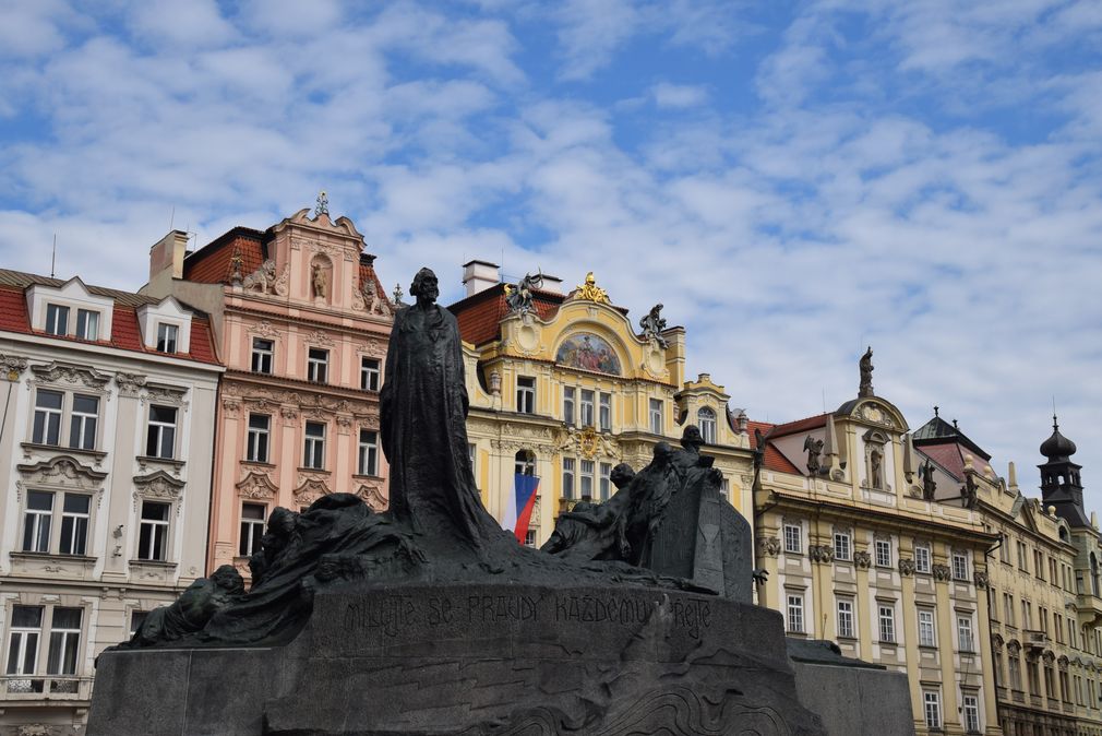 Le monument à Jean Hus, grand réformateur tchèque mort sur le bûcher en 1415, se dresse sur un côté.