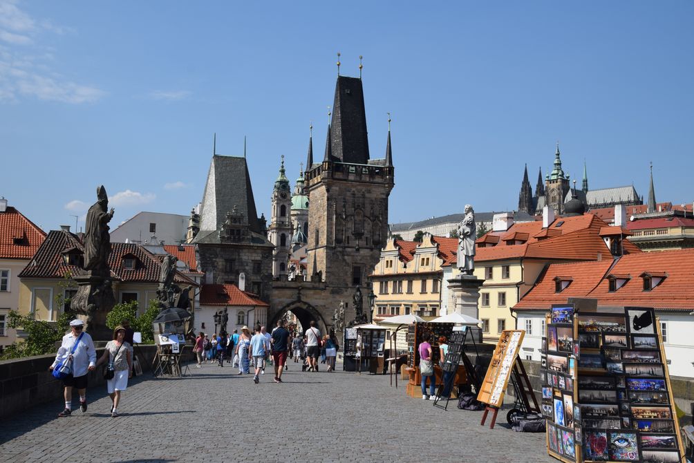 Etonnommant praticable, le Pont Charles à l’heure du déjeuner bordé par ses mythiques statues et ses colporteurs.
