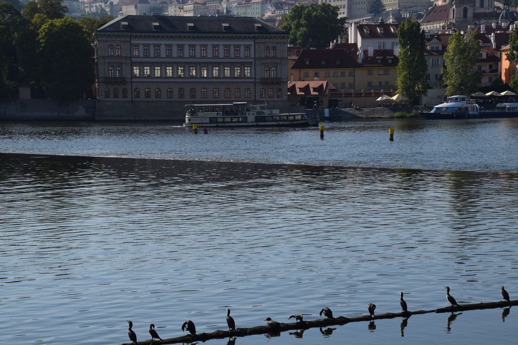 La Vltava attire des oiseaux en tous genres. Ici, spécimens d’une même espèce -dont je ne connais pas le nom- alignés sur un rebord.