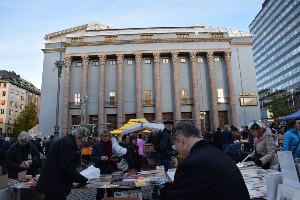 Devant l’Opéra, au coeur de Stockholm, un pêcheur s’installe.
