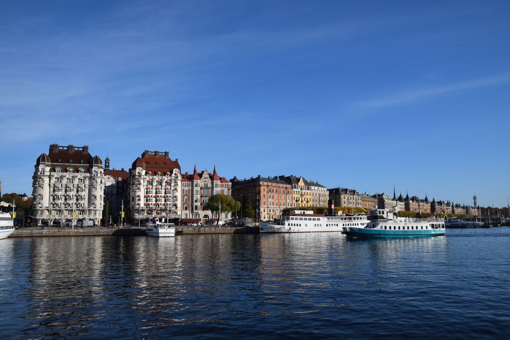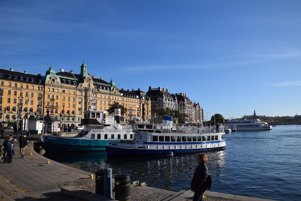 Les mauvais esprits ironisaient sur notre idée de faire un voyage à Stockholm au mois d’octobre. Nous avons bénéficié d’un temps magnifique. Et cette ville parcourue par de larges bras de mer a su apprivoiser l’eau qui l’entoure de toutes parts.