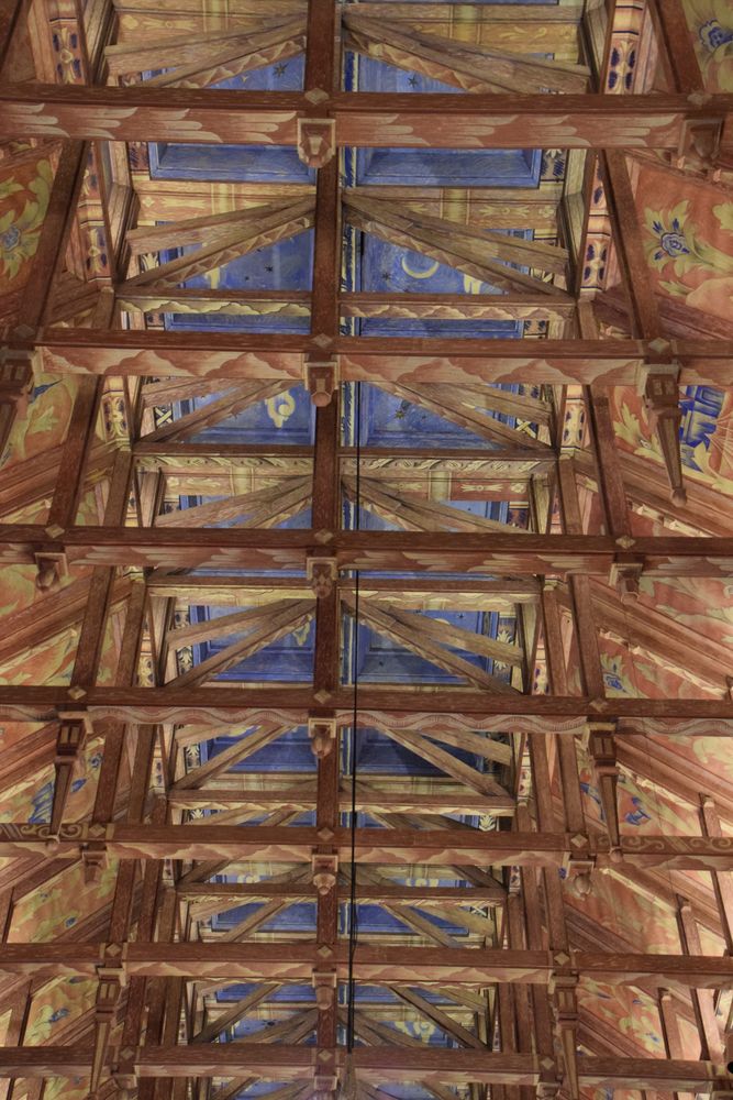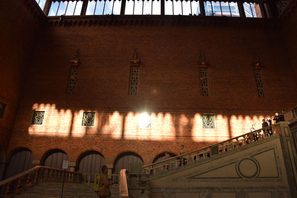 C’est là que se tient le banquet du Prix Nobel. Le grand escalier qui mène à l’étage a été soigneusement étudié pour être compatible avec robes longues et talons hauts. La salle du conseil est époustouflante avec sa charpente qui fait penser à un bateau renversé, laissant transparaître les dessins colorés du plafond.