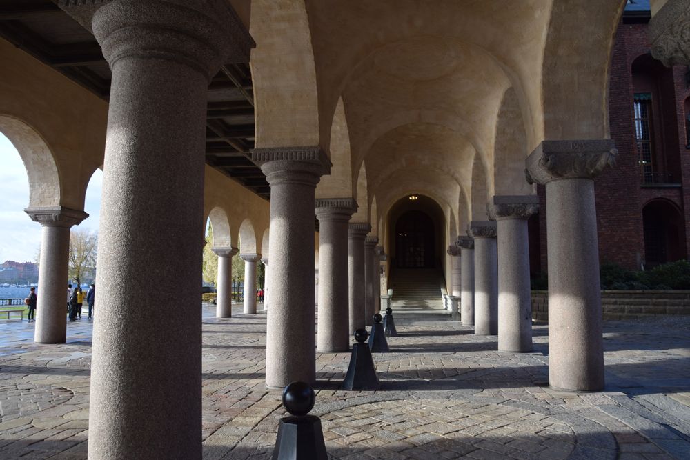 Galerie couverte entre la cour intérieur et les jardins de l’Hôtel de ville de Stockholm.