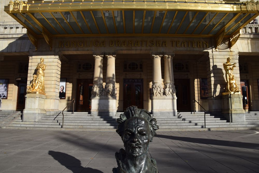 Le Théâtre royal dramatique de Stockholm avec le buste de Strindberg devant.