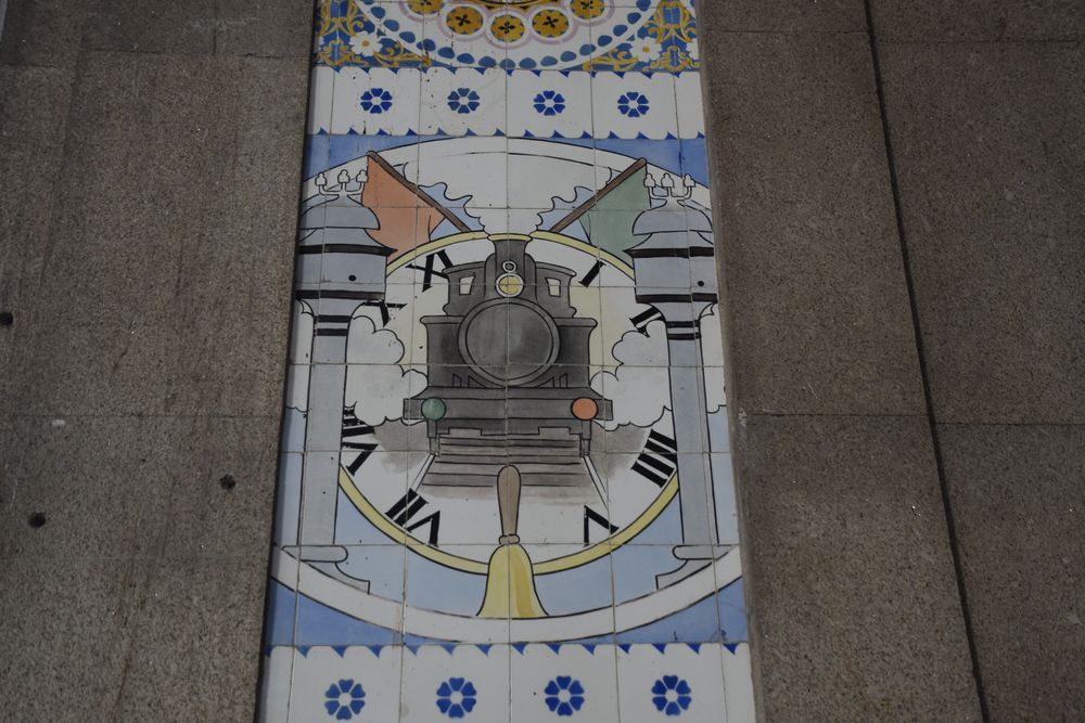Motif de locomotive en céramique à la gare Sao Bento à Porto.