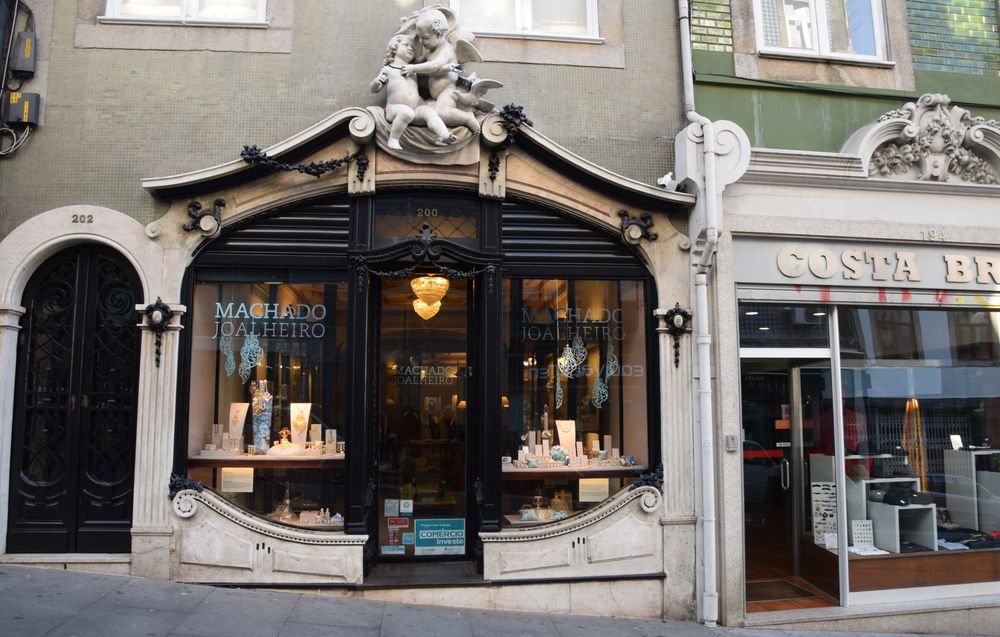 La bijouterie Machado est sans doute l’une des plus belles boutiques de la rue du 31 de Janeiro avec sa vitrine Art nouveau surmontée de deux angelots.