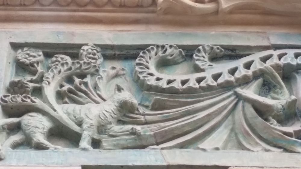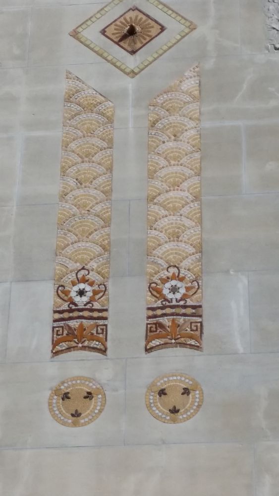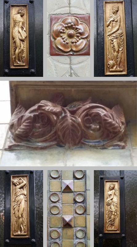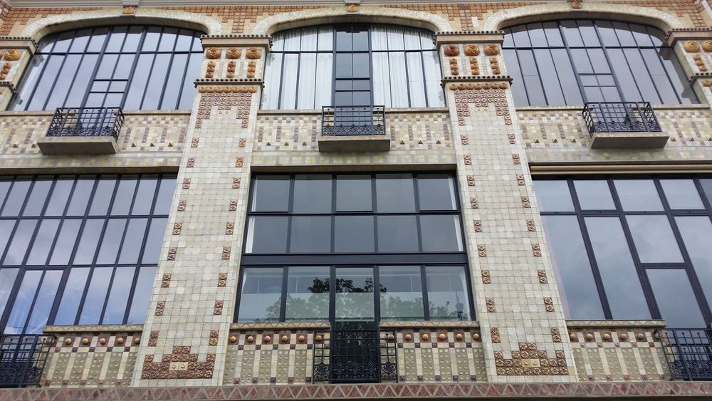 Arfvidson. De loin, on voit surtout le rythme ample des belles ouvertures. De près, j’ai été subjuguée par son habillage en grès d‘Alexandre Bigot. Les détails sont particulièrement soignés avec des panneaux géométriques rehaussés par des motifs floraux.