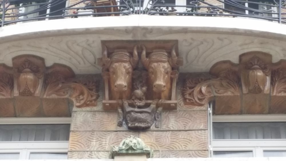 Le céramiste Alexandre Bigot avait commandé cet immeuble du 29 avenue Rapp à Jules Lavirotte. Il a reçu le prix des façades de Paris en 1901. Pierre, grès, stuc, céramiques, les matériaux utilisés sont très variés. Les motifs abondent, les couleurs claquent. A noter les bœufs qui soutiennent le grand balcon.