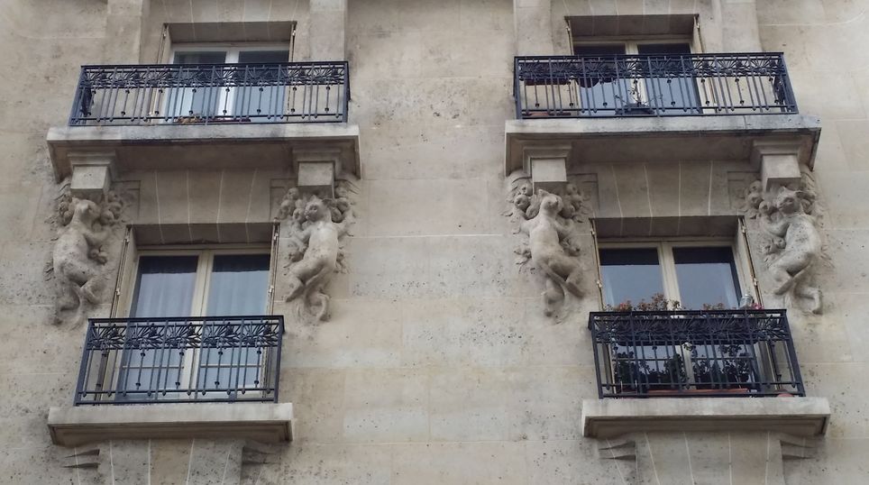Suspendus à la façade, ces chats de rue Léon Delhomme sont irrésistibles. Il faut lever les yeux car ils sont accrochés aux balcons du haut.