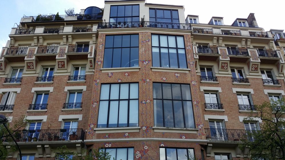 Derrière le cimetière du Montparnasse, cet immeuble où résida l’aviatrice Maryse Bastié a été construit par Georges Grimber en 1929. Il est entièrement recouvert d’une peau en céramique sur laquelle se déploient des fleurs colorées. Nous passons à une autre époque. Voilà l’Art déco.