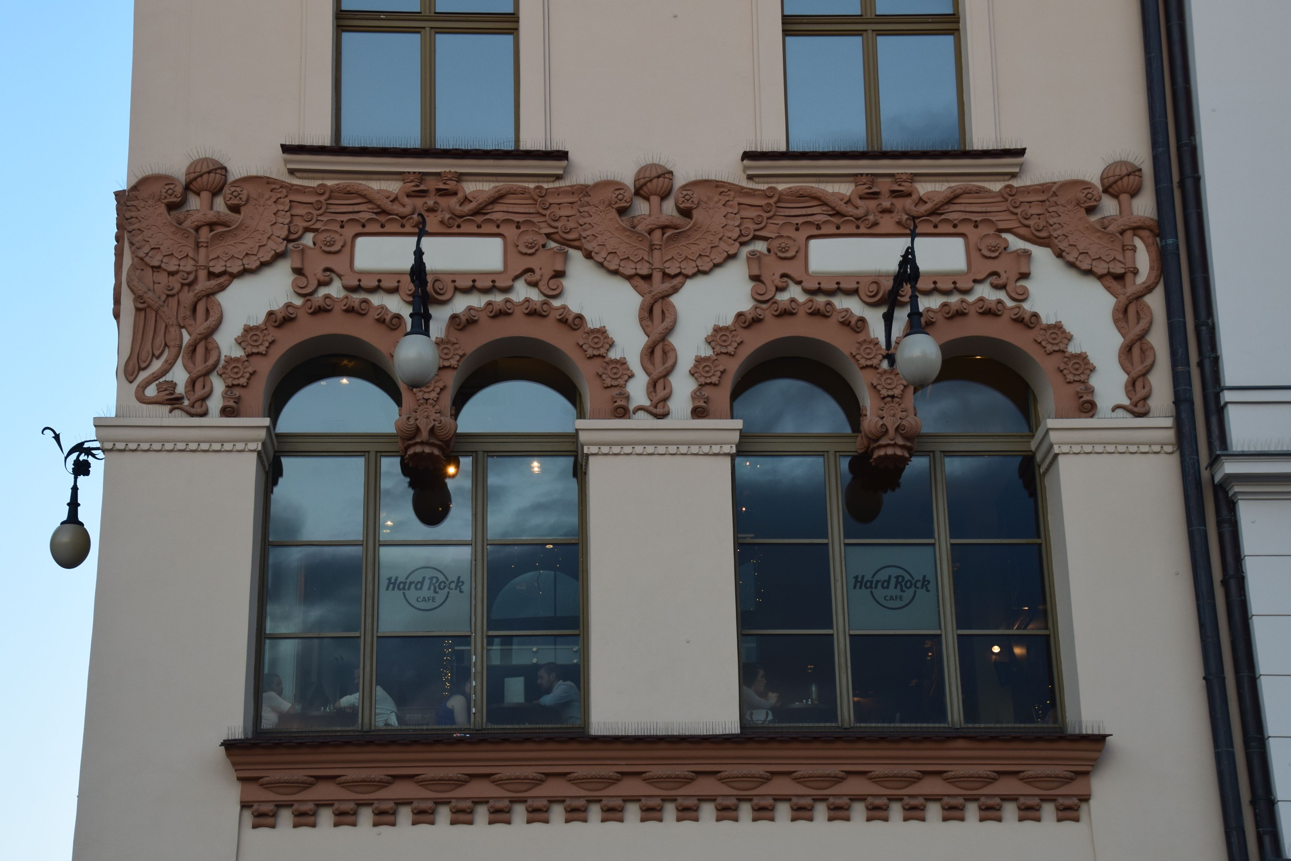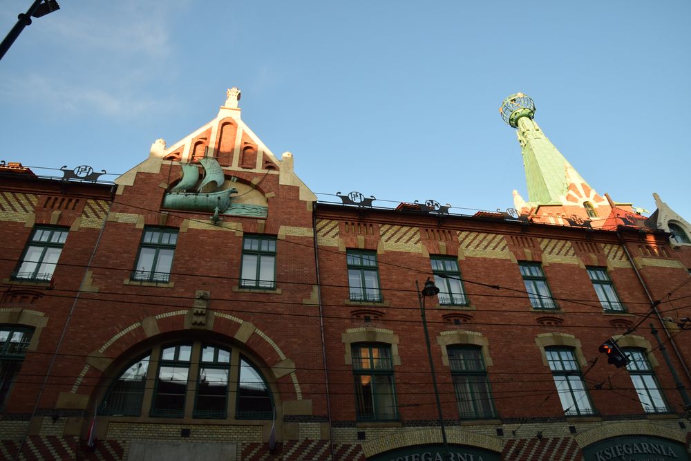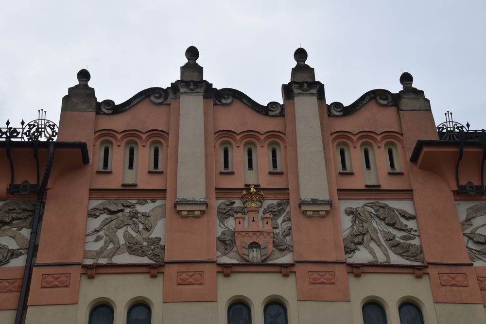 Ce bâtiment d’angle construits par Ludwik Wojtyczko et Rajmund Meus se pare d’ornement en stuc couleur terre cuite puisant leur inspiration dans le folklore polonais.