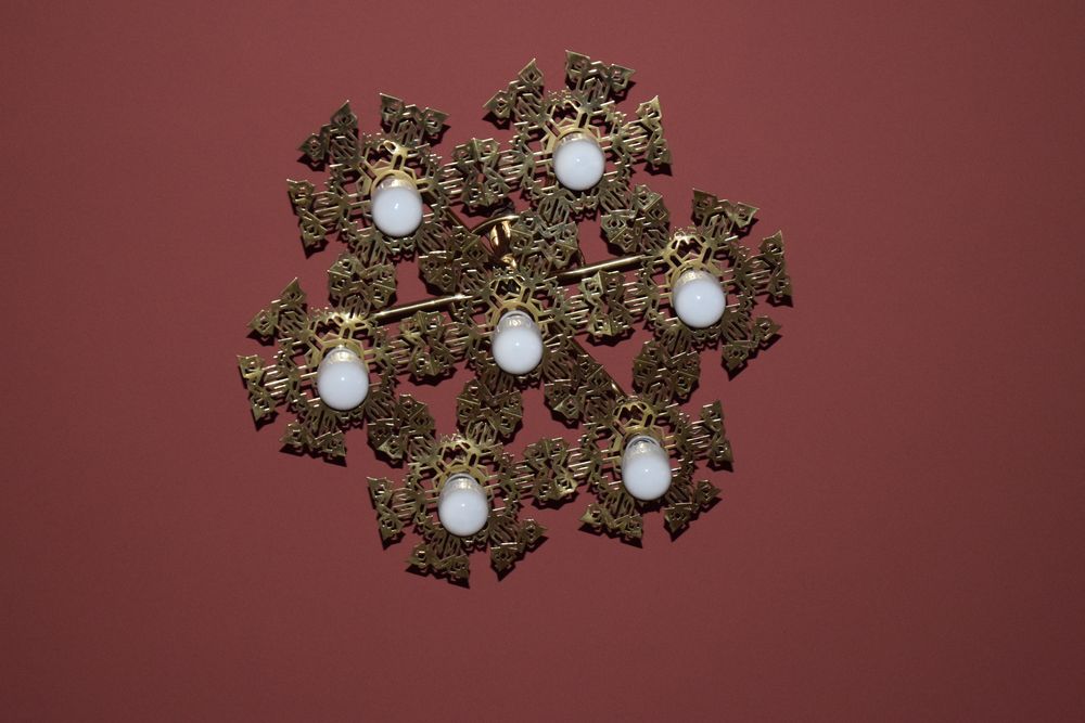 Détail du plafond et d’un luminaire dans les foyers du Vieux Théâtre.