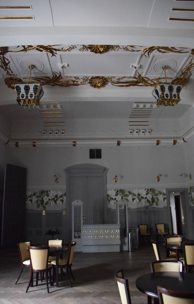 La rampe d’escalier en métal découpé reprend le motif des feuilles de châtaignier, symbole de Jeune Pologne, qu’on retrouve aussi en frise en haut des murs. On peut aussi accéder à la salle de réunion.