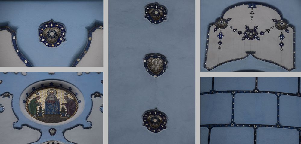 En outre, ses reliefs sont soulignés par de minces cordons de mosaïques bleu plus foncé et des motif en mosaïques argent viennent ponctuer la façade.