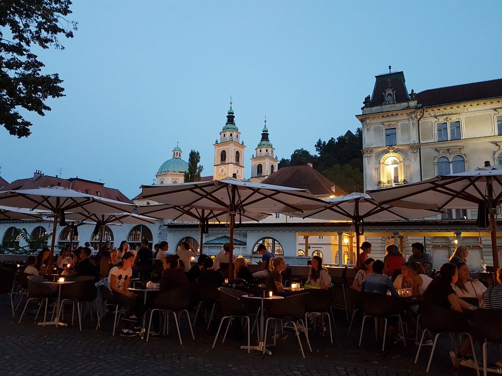 Une esplanade avec ses terrasses qui prend sur Wolfova Ulica à Ljubljana.