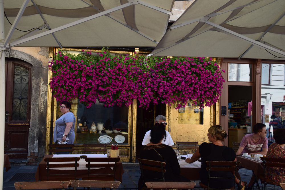 Un rideau de fleurs borde la vitrine de Catbriyur à Ljubljana.