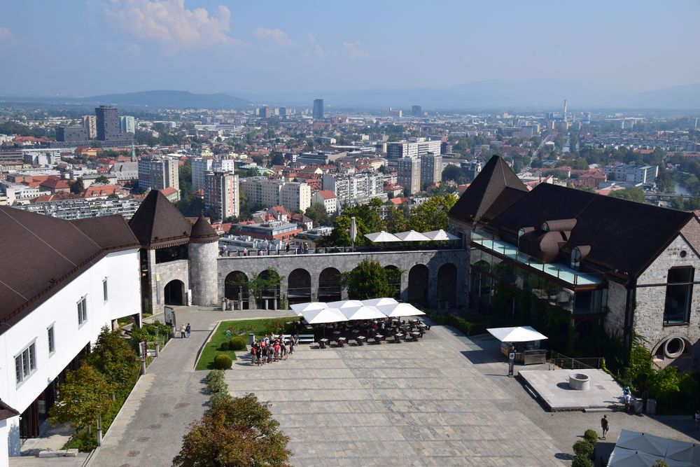 Depuis le château, on aperçoit l’immeuble carré de la bibliothèque construite par Plecnik à Ljubljana.