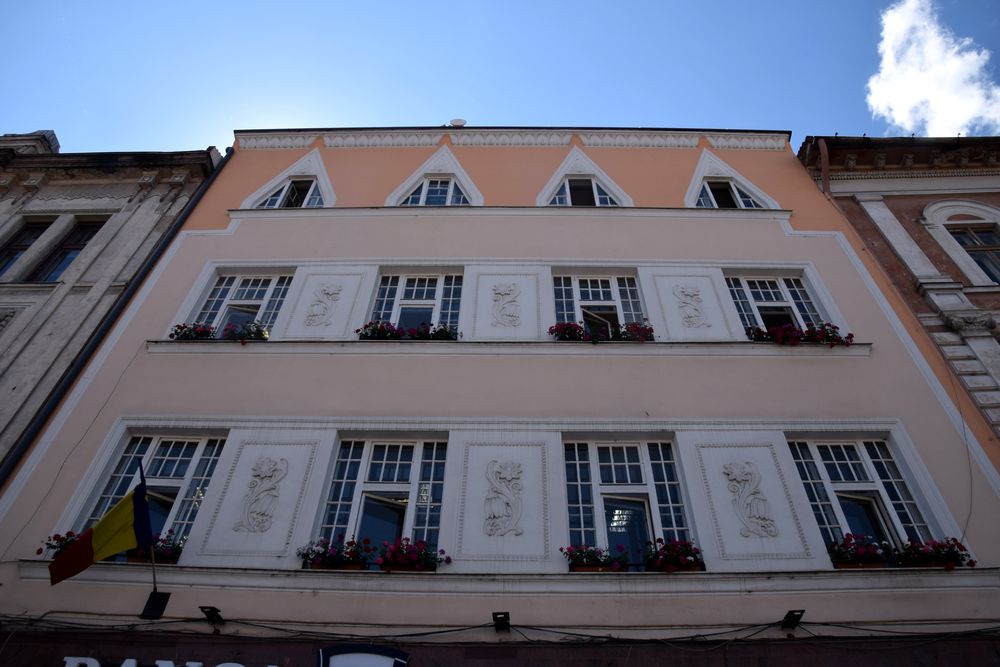 Tout près de l’Opéra de Clju-Napoca, une maison dont les roses et les ors resplandissent.
