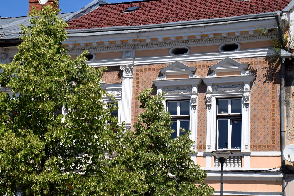 Un soin tout particulier a été apporté à la façade de cette maison de Cluj-Napoca entre ses fenêtres, ses fers forgés et ses motifs en céramique.