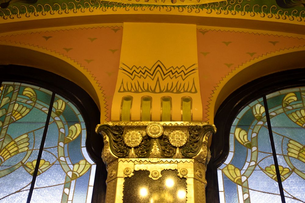Décor en bronze du chapiteau d’une colonne en grès noir entre deux vitraux au Palais de la Culture.